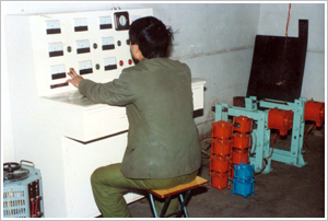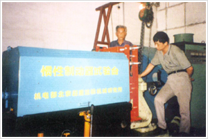 節(jié)能制動(dòng)器創(chuàng)始人張家政先生(左一)在北京起重運(yùn)輸機(jī)械研究所實(shí)驗(yàn)臺(tái)上進(jìn)行檢測(cè)